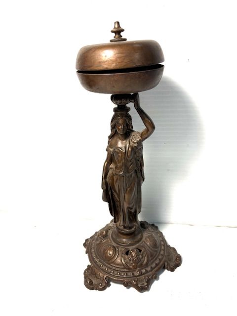 description: Antique Brass Counter bell held up by lady statue,Size 10 inches tall.