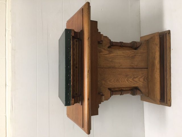 description: Podium/Lectern in solid oak with leather top.church, school,teaching, Size; 31 wide x 37 high x 15 deep