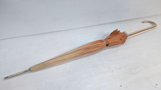 description: Orange umbrella with leather handle.