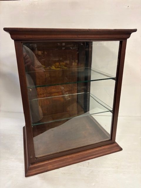 description: A glass display case in oak, Size 24 inches high x 19 wide x 16 deep
