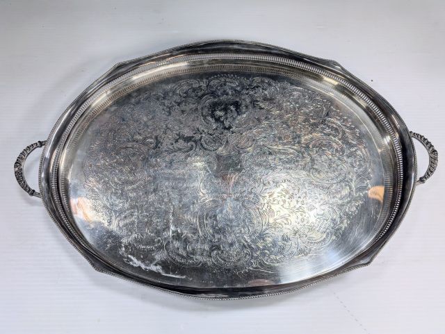description: Plated silver serving tray. Dining, silver, tray, platter